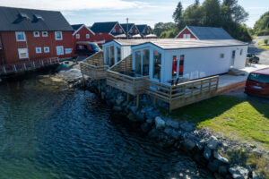 2 Häuser direkt am Wasser. Wohnzimmer mit integrierter voll ausgestatteter Küche mit Geschirrspüler, Mikrowelle, Toaster und Kaffeemaschine, Dusche/WC und 2 Schlafzimmern mit jeweils 2 Einzelbetten.